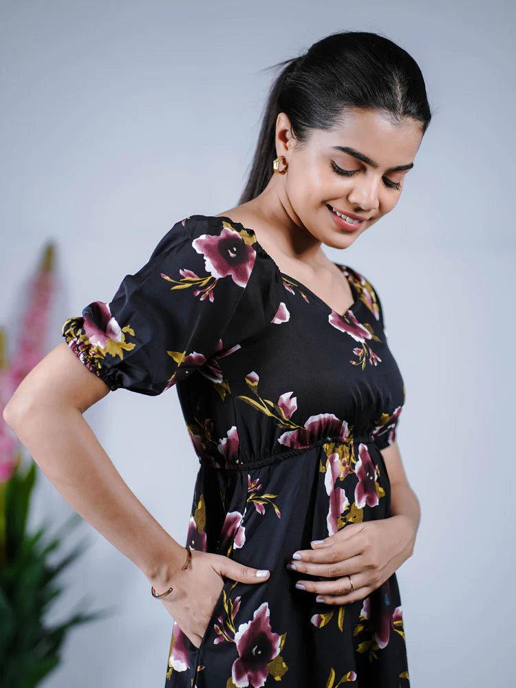 Eilaa - Black with Dark Purple Bloomy Charm Empire dress PSD410-MD988